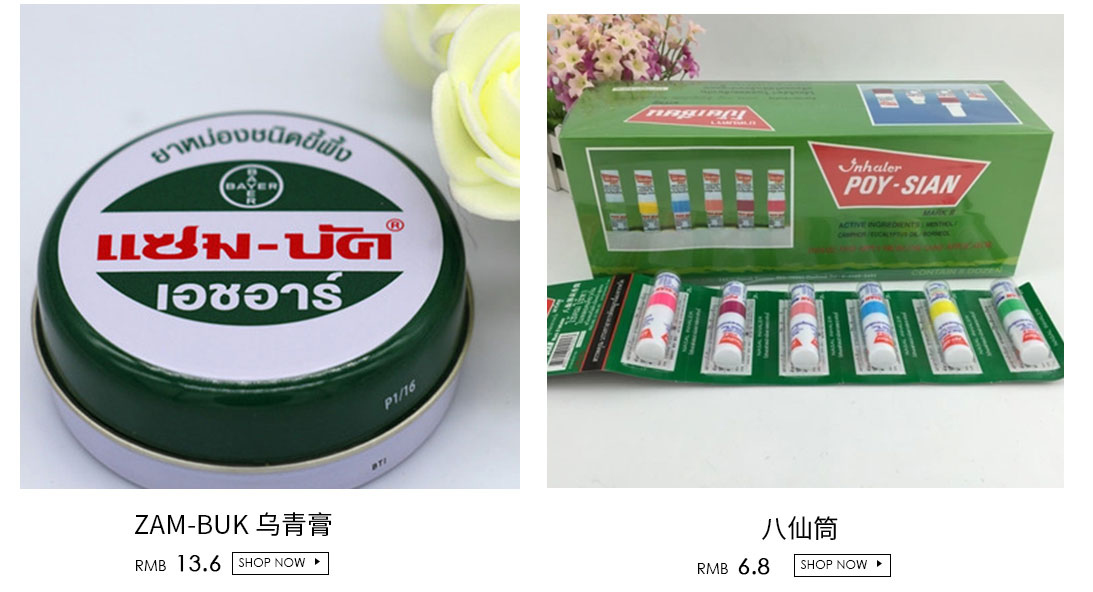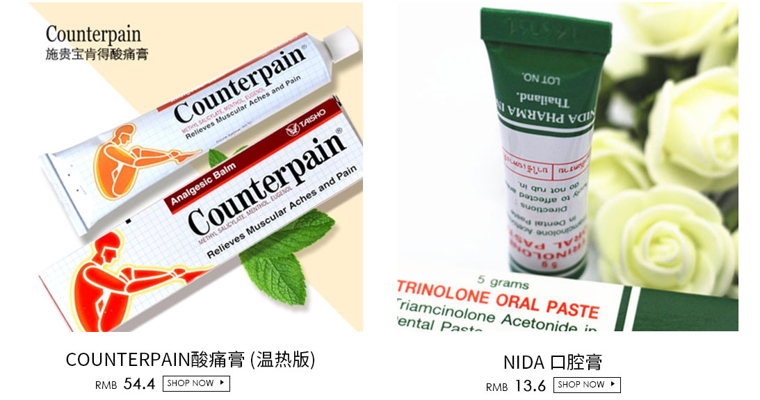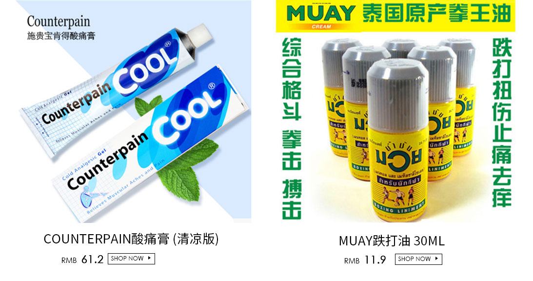 咨询客服COUNTERPAIN 酸痛膏(清凉版) 药物功效:主治肌肉酸痛、关节炎、腰痛、扭伤、撞伤、落枕、冻疮等 使用方法:只供外用。每日3到4次涂抹适量于患处,轻轻按摩几分钟,可以让膏药充分吸收,效果会更好 MUAY 跌打油 30ML 药物功效:减轻肌肉酸痛,关节扭伤,酸痛,肌肉淤伤,关节炎引发的酸痛,因伤风而引起的肌肉酸痛等症状。适宜各运动员,工作人员及运动后作用 使用方法:将药油涂在患处,然后加以按摩,使药油渗入皮肤 COUNTERPAIN 酸痛膏(温热版) 药物功效:主治肌肉酸痛,风湿痛,关节炎,扭伤,撞伤,中老年人关节疼痛 使用方法:只供外用。每日3到4次涂抹适量于患处,轻轻按摩几分钟,可以让膏药充分吸收,效果会更好 温馨提示:泰国老字号,特效按摩膏,对腰肌劳损,肌肉损伤引起的酸痛有很好的作用。运动过后的肌肉酸痛,肌肉疲劳一擦,隔天就好,让您重新神百倍 NIDA 口腔膏 药物功效:口腔内发炎,腮颊、牙龈、舌头、急慢性口腔粘膜损害,包括间歇溃疡性口炎、糜烂性扁平苔藓,托牙性口炎,创伤性损害 使用方法:挤岀药膏在手指尖大约1/4到1/2英寸,敷抹于伤口发炎之处,然后薄薄敷在伤口周围,每日3-4次,饭后或睡前 TIGER 膏药贴 710CM(清凉版) 药物功效:肌肉疲劳、肌肉疼痛、肩肌僵直、挫伤、扭伤 使用方法:先将药布表面的塑胶膜拉开,再将药布敷于清洗后的患处。每日只许贴一次至两次。请在入浴前一小时摘去本品,及在浴后半小时之后使用本品 TIGER 肩颈酸按摩膏强效版 药物功效:有效舒缓肩膀和颈部酸痛 使用方法:将适量的药膏轻轻地涂抹在僵硬或痠痛肌肉的部位并轻柔按摩.一日内涂抹2至4次 ZAM-BUK 乌青膏 药物功效:外敷药膏,适用于蚊虫叮咬、红肿、轻微扭伤、皮肤痕痒、刮伤、红疹、烧伤、烫伤、及脚部疼痛等症状 使用方法:薄薄一层外涂抹于患处,也可以用消毒纱布覆盖 温馨提示:对跌打扭伤所引起的淤血肿块特别有效。平常不小心磕碰到的淤青伤痕,使用一次就能消除70-80% 八仙筒 药物功效:缓解伤风鼻塞,提神醒脑,头晕昏眩,晕车,晕船。熬夜提神、缓解头晕、通鼻塞、防中暑、防蚊、消肿 使用方法:拧开一头可嗅吸,旋开另一头可滴液擦抹 温馨提示:在泰国几乎人手一支,一边是鼻通,一边是药油!夏天防暑,冬天防流感,一年四季都合适用的宝贝! 儿童驱蚊贴 药物功效:特含泰国盛产的香茅草精油,12小时贴身保护宝宝原理蚊子骚扰。可忒在宝宝衣服上货其他靠近宝宝身体的地方,如婴儿车上、书包上、帽子上、床头等一米距离内的地方。这样可以让宝宝玩得开心,睡得想想 使用方法:每次一贴,可保持12小时有效。如去蚊子多的地方,可在不同地方贴多一片,全方位保护宝宝 温馨提示:特有得香茅草的清香,温和安全。香茅草是泰莱特特有的香料,可以吃的东西,用起来爸爸妈妈特别放心 嘉胃斯康 药物功效:嘉胃斯康药片(48片装)是嘉胃斯康药片的新装改良配方,药片较少,更少泡沫,更容易咀嚼及吞嚥,能迅速纾缓胃酸倒流引起的火烧心,效力长达四小时。 能迅速减轻胃灼热及由胃酸倒流所引致之不适 使用方法:口服。服用前先摇匀。成人及12岁以上儿童在进餐后及睡前服用10-20毫升(2-4羹5毫升的匙羹),每日最多服4次,12岁一下儿童,经医生指示下服用 去黑头粉丝霜 药物功效:去黑头、白头,收缩毛孔 使用方法:清洁面部肌肤(建议用温水洗脸,为了打开毛囊),然后取出适量的芦荟胶涂抹在需要去黑头或者白头的地方,然后立即把配套的纸张贴紧,在等5-10分钟左右干后把纸张撕出来,如黑头、白头较多,可连续做2次,效果比较明显!最后再用冷水洗脸有助于收紧毛孔 双葫芦凉茶粒 药物功效:口苦吞燥,消署,四季受寒,痢水食带,消署热带 使用方法:每次一包四粒,温水一杯服用(孕妇可服)。多喝水,以利排泄更好;重者两包,小儿减半